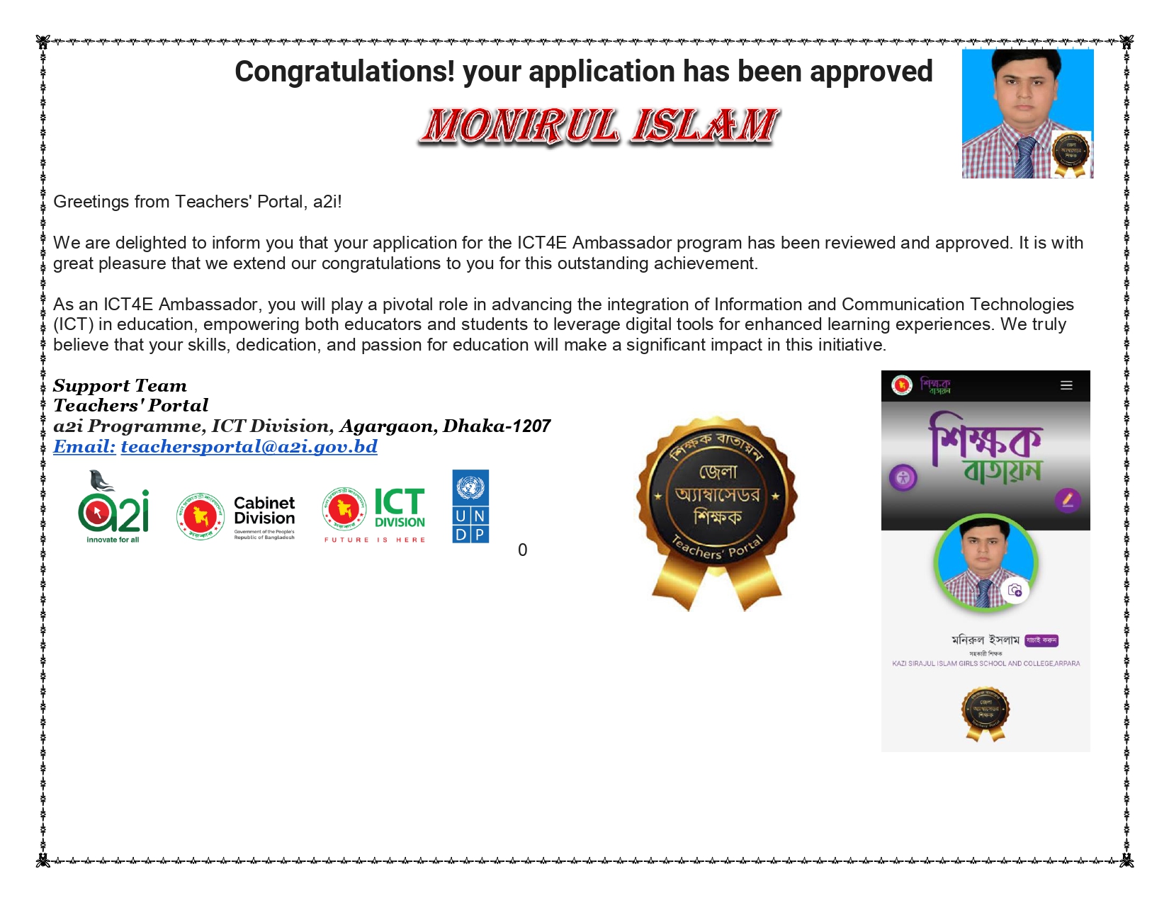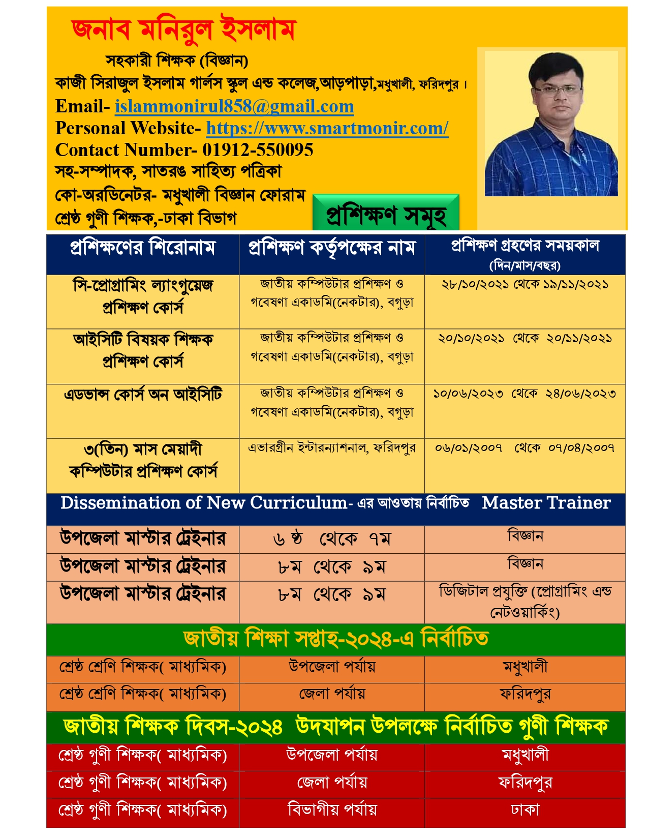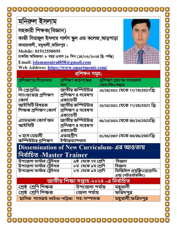 সহকারী শিক্ষক (নির্বাচিত শ্রেষ্ঠ শিক্ষক, ঢাকা বিভাগ ও A2i জেলা অ্যাম্বেসেডর শিক্ষক), বিজ্ঞান বিভাগ, কাজী সিরাজুল ইসলাম গার্লস স্কুল এন্ড কলেজ